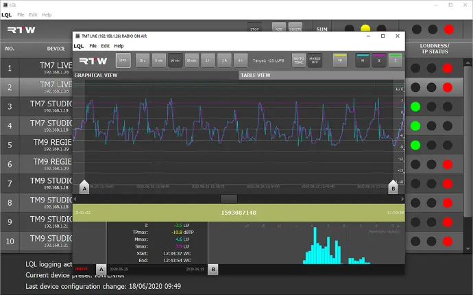 Requires Loudness license SW20002 and Logging Data Server license SW20014 on TM7, TMR7 or TM9 devices and the Logging instrument placed in an audio group on them.